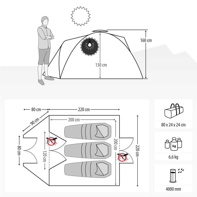 * Om uw (tent)grondzeil te beschermen tegen scherpe ondergronden (takken, doornen, stenen) én om een nog betere waterbestendingheid te garanderen, raden wij bij gebruik van de Oak-3 Dark Series ten zeerste het speciaal op maat gemaakte Oak-3 grondzeil aan.